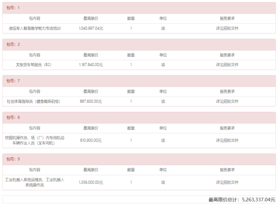 包1、包7、包8、包9:投标人须具有法定培训资质(高等院校、职业院校、技工院校、公办职业学校等须提供事业单位法人证书;民办培训机构为企业的,须提供政府主管部门颁发的民办学校办学许可证;民办非企业单位,须提供政府主管部门颁发的民办非企业单位登记证书和民办学校办学许可证)。