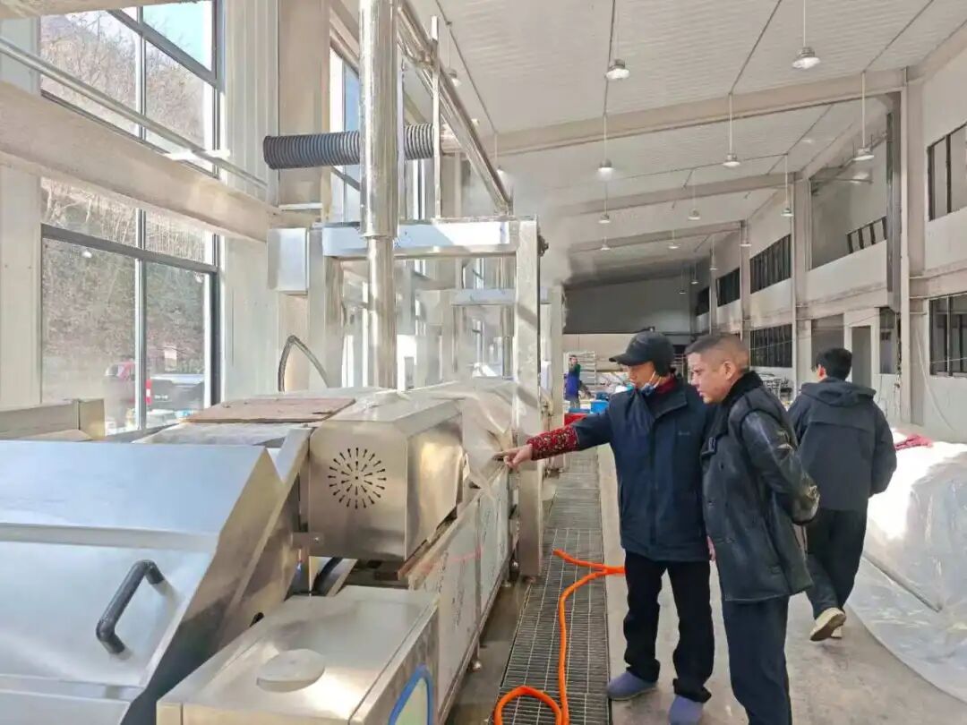 12月8日,治平乡党委书记李长建(右)深入天麻加工厂一线,实地查看生产设备运行状况,叮嘱严把品质关、提效增收。