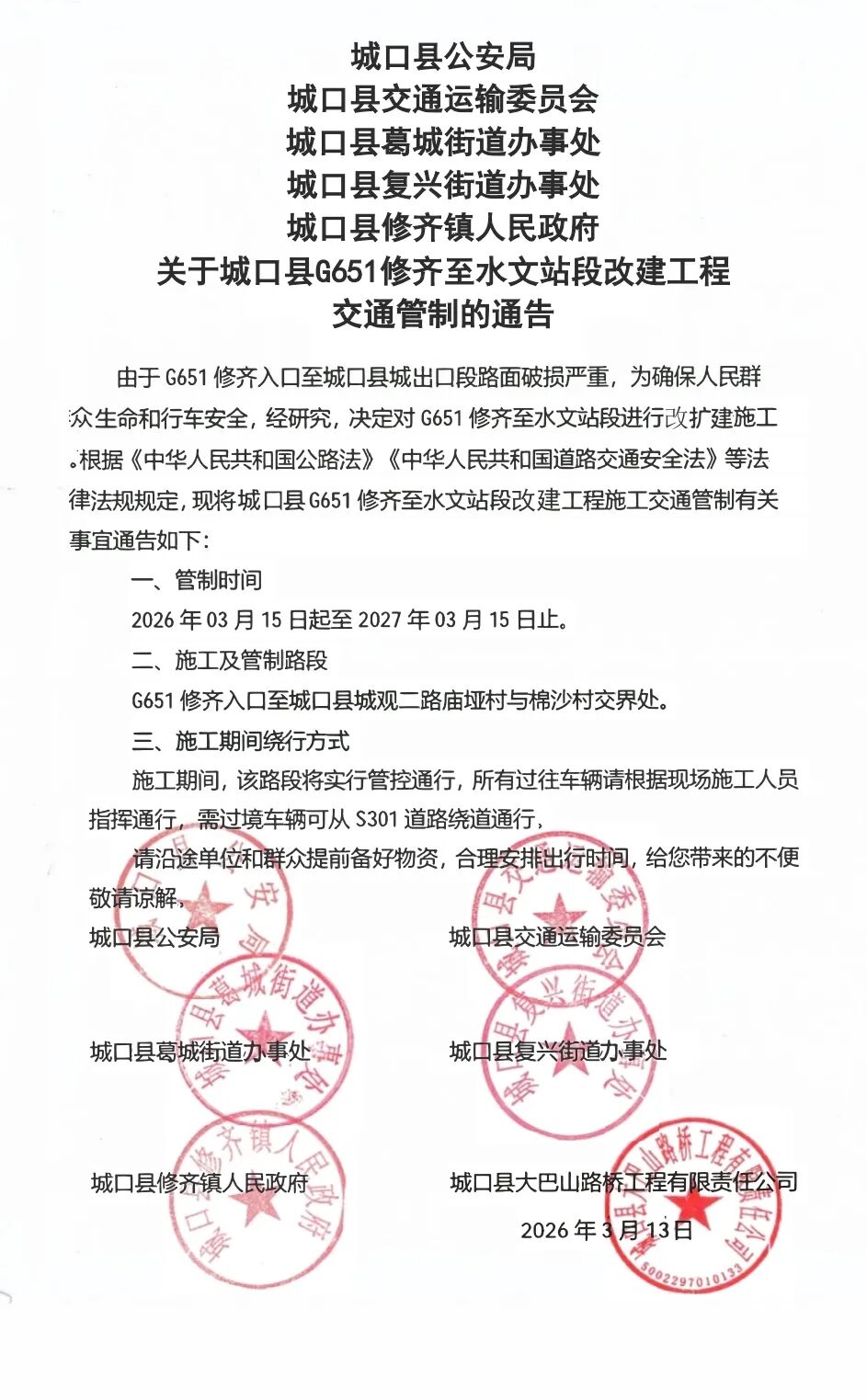 【交通路况】G651修齐至水文站段改建工程交通管制的通告