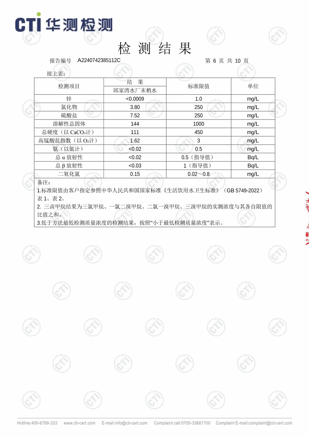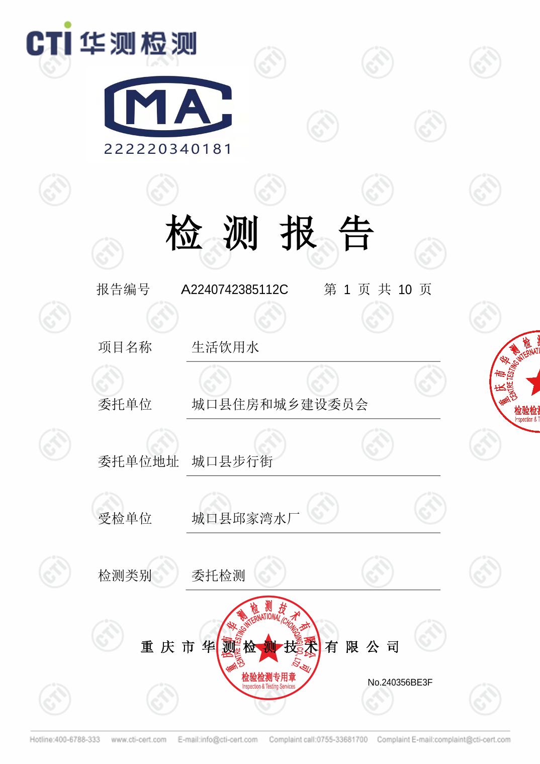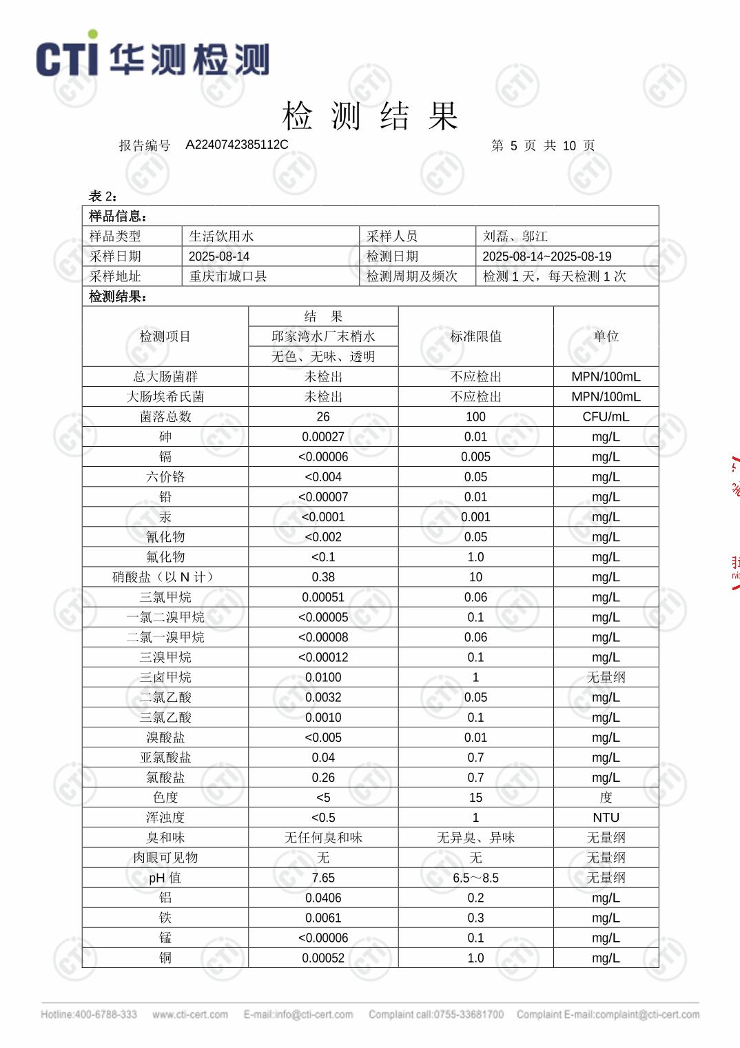 城口县邱家湾水厂2025年8月生活饮用水检测报告