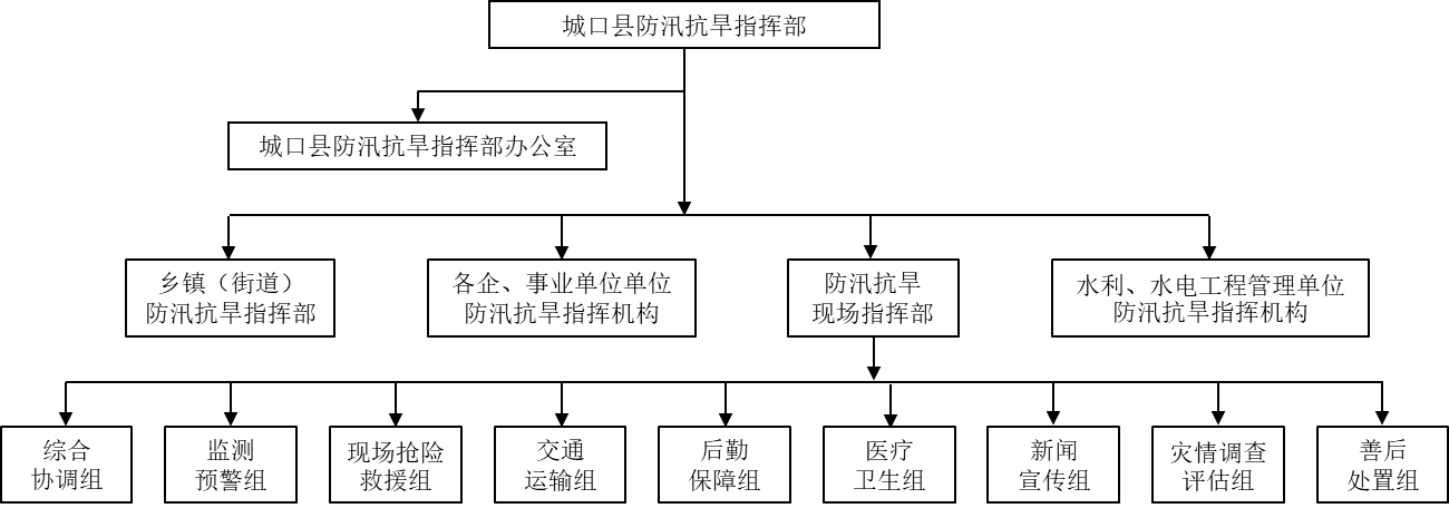 防汛抗旱现场指挥部实行指挥长负责制,由县政府有关领导任指挥长,现场指挥部下设综合协调组、监测预警组、现场抢险救援组、交通运输组、后勤保障组、医疗卫生组、新闻宣传组、灾情调查评估组、善后处置组等9个应急处置工作组。城口县防汛抗旱指挥体系图见附件1。