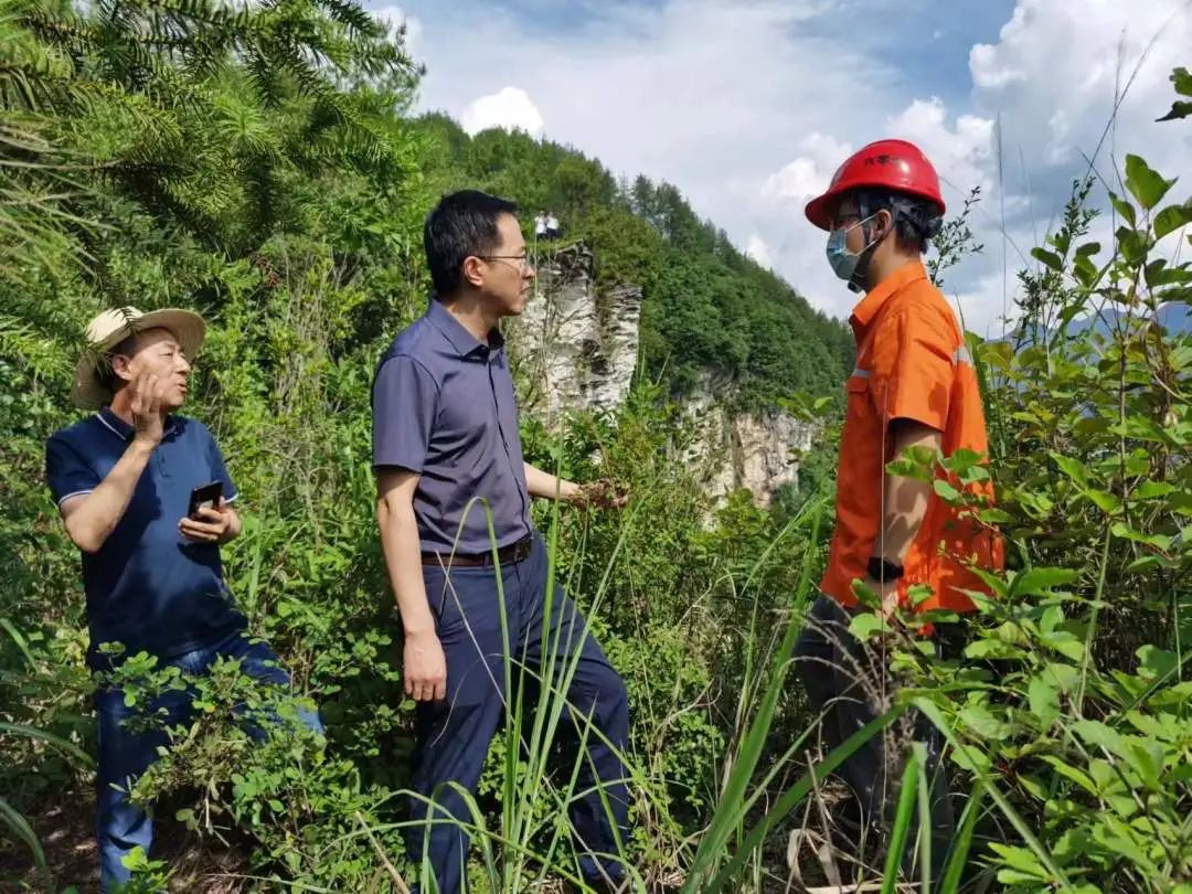 6月13日,明通镇党委书记李方元同地质专家查看虎儿岩危岩情况,商量应急处置方案。
