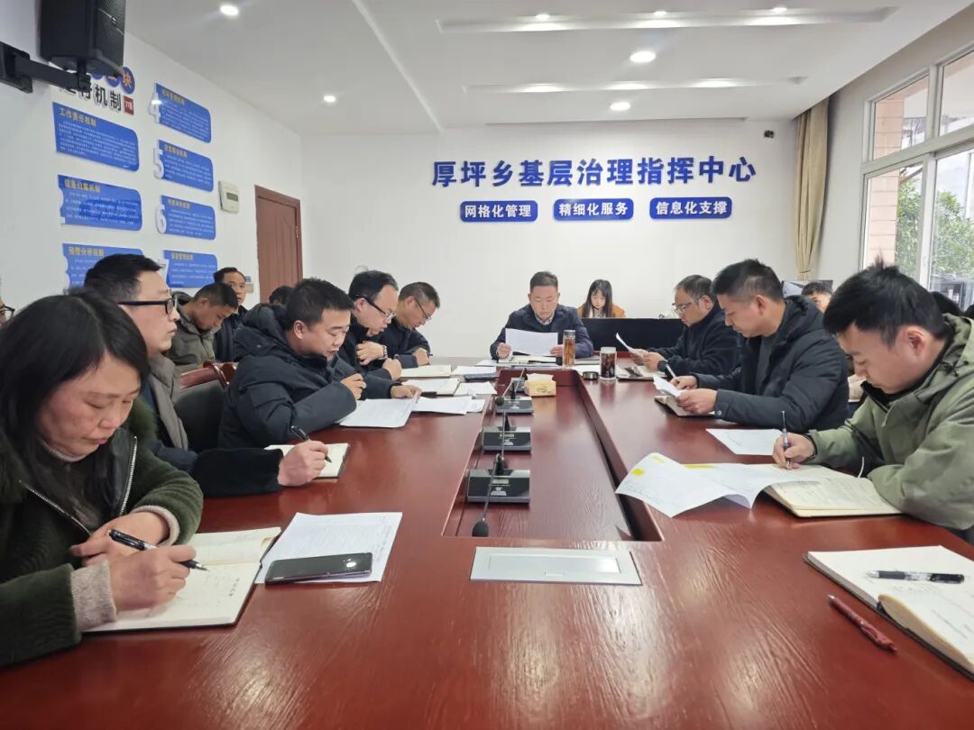 12月8日,厚坪乡党委书记曾棱(中)主持召开周一例会,就近期巩固衔接、机要保密、安全稳定等工作进行部署。提出要主动落实、亲自落实、立马落实、细致落实、协同落实年底各项重点工作,确保交出厚坪高分答卷。