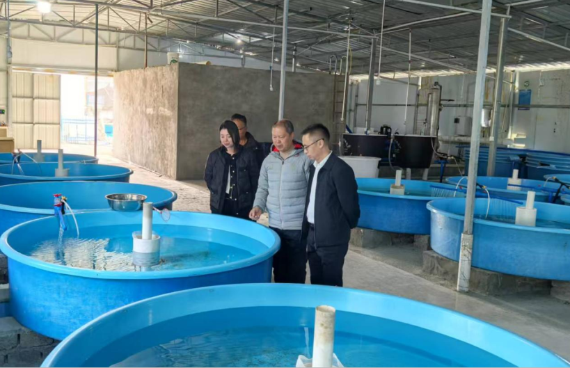12月9日,鸡鸣乡党委书记贺鹏(右一)深入辖区重点企业雪宝冷江渔业开展调研走访,查看企业室内养殖车间的养殖池、水循环设备等生产设施,详细了解渔业养殖规模、技术模式及运营现状,现场倾听企业发展诉求,为后续精准服务企业、助力特色产业提质增效打下基础。