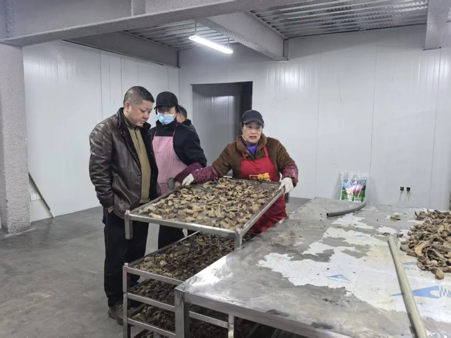 2025年12月28日,治平乡党委书记李长建(左)深入辖区天麻加工厂,实地查看天麻深加工系列产品,细致询问生产工艺、品质管控及市场销售等情况。