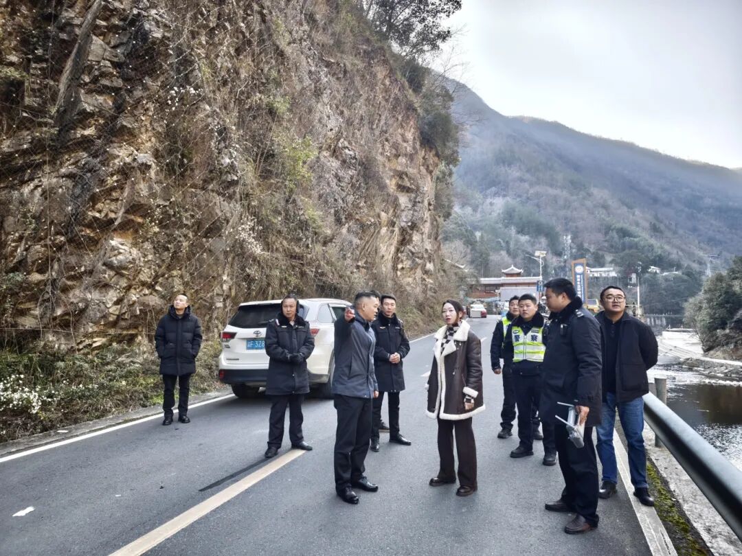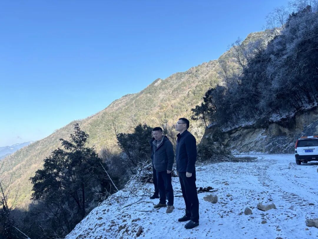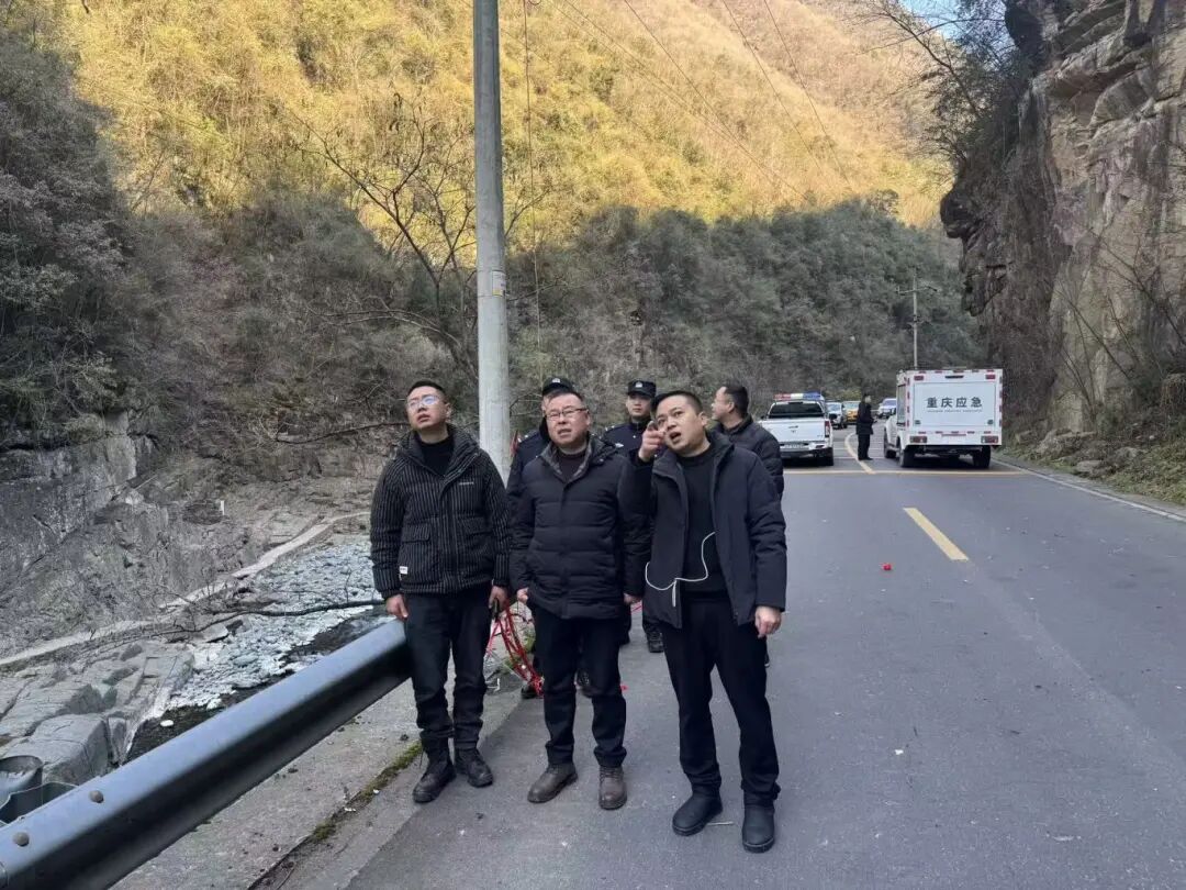 1月6日,高观镇党委书记庞雪飞(中)带队查看省道S301青龙峡垮塌路段险情,督导应急处置工作,提出要科学制定抢通方案,严防次生灾害,尽快恢复安全通行。