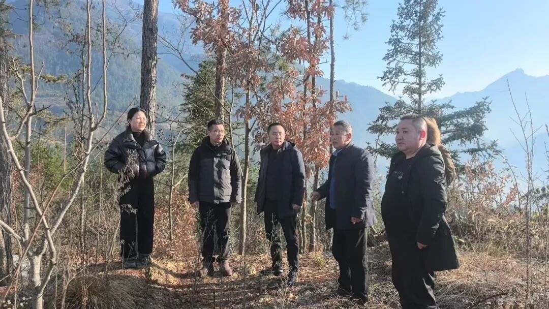 1月5日,河鱼乡党委书记代忠相(右)带队查看城口县野生石斛原生境保护点项目施工现场,了解工程进度,提出要绷紧安全生产弦、严把工程质量关,确保项目高标准推进。