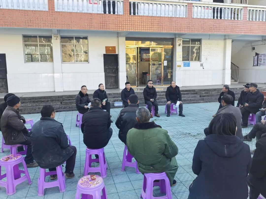 1月8日,坪坝镇党委书记代信清(前排左二)带队到三湾村召开院坝会,开展政策宣讲,规划产业发展,强化森林防火等岁末年初重点工作。