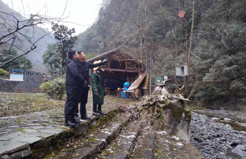 1月7日,东安镇党委书记贺书逊(中)实地查看省道S301溪城路K178+750(高观镇青龙峡漂流处)道路内侧危岩垮塌现场,研判风险,并迅速确定紧急搭建临时人行便桥方案,衔接对岸既有步道形成临时绕行通道,最大限度缩短群众绕行距离,保障基本出行需求,把对日常生活的影响降到最低。