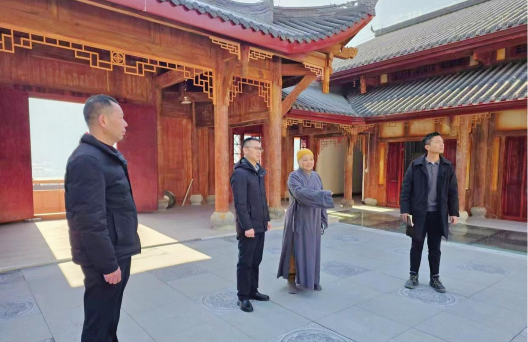 1月8日,鸡鸣乡党委书记贺鹏(左二)带队走访鸡鸣寺院,检查寺院排危修复工程序时进度情况,详细了解寺院管理、备案管理、消防及食品安全、宗教活动安全等情况,提出要进一步规范寺院管理,对内传承好佛法,对外积极服务好社会发展。