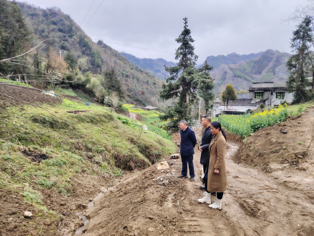 3月19日,蓼子乡党委书记符美森(右二)带队联合高指办、重庆高速集团到长湾村磨槽湾高速弃渣场现场查看行洪水沟建设情况及施工安全。