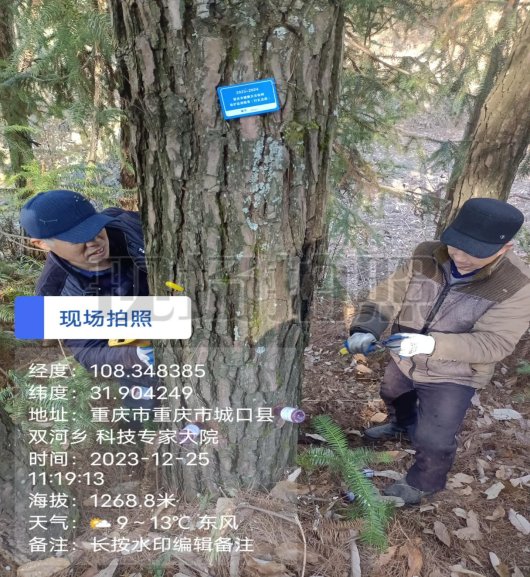 (12月25日,专业施工队在双河乡余坪村为大古松树打孔注药)