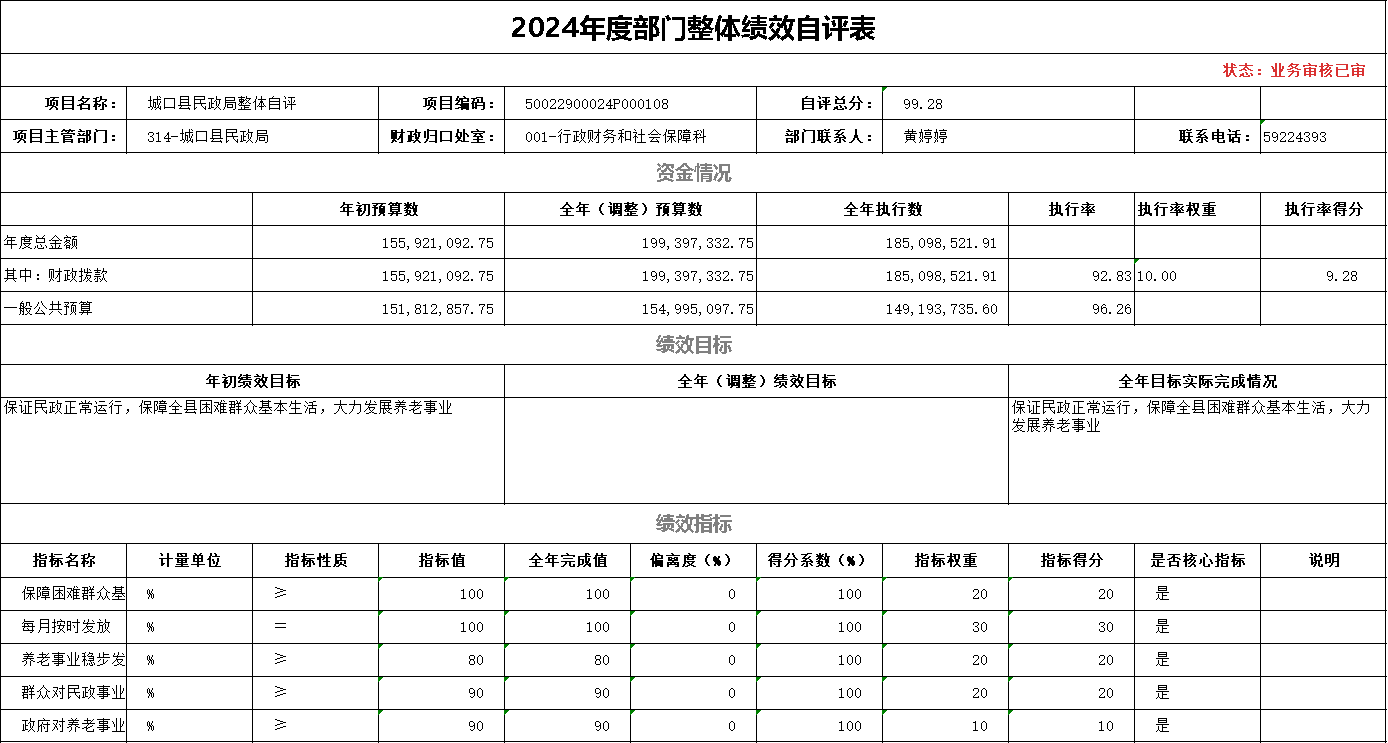 我部门(单位)对城口县民政局整体自评开展了绩效评价,涉及财政拨款项目资金18509.万元,评价得分99.28分,评价等次为优,绩效评价发现了前期预算不够精准等主要问题,提出加强预算评价等下一步工作建议;对“特困人员基本生活费用”、“孤儿生活费用”“孤儿及事实无人抚养儿童助学工程”开展了绩效评价,涉及财政拨款项目资金2190.4万元,评价得分100分,评价等次为优,绩效评价未发现问题。