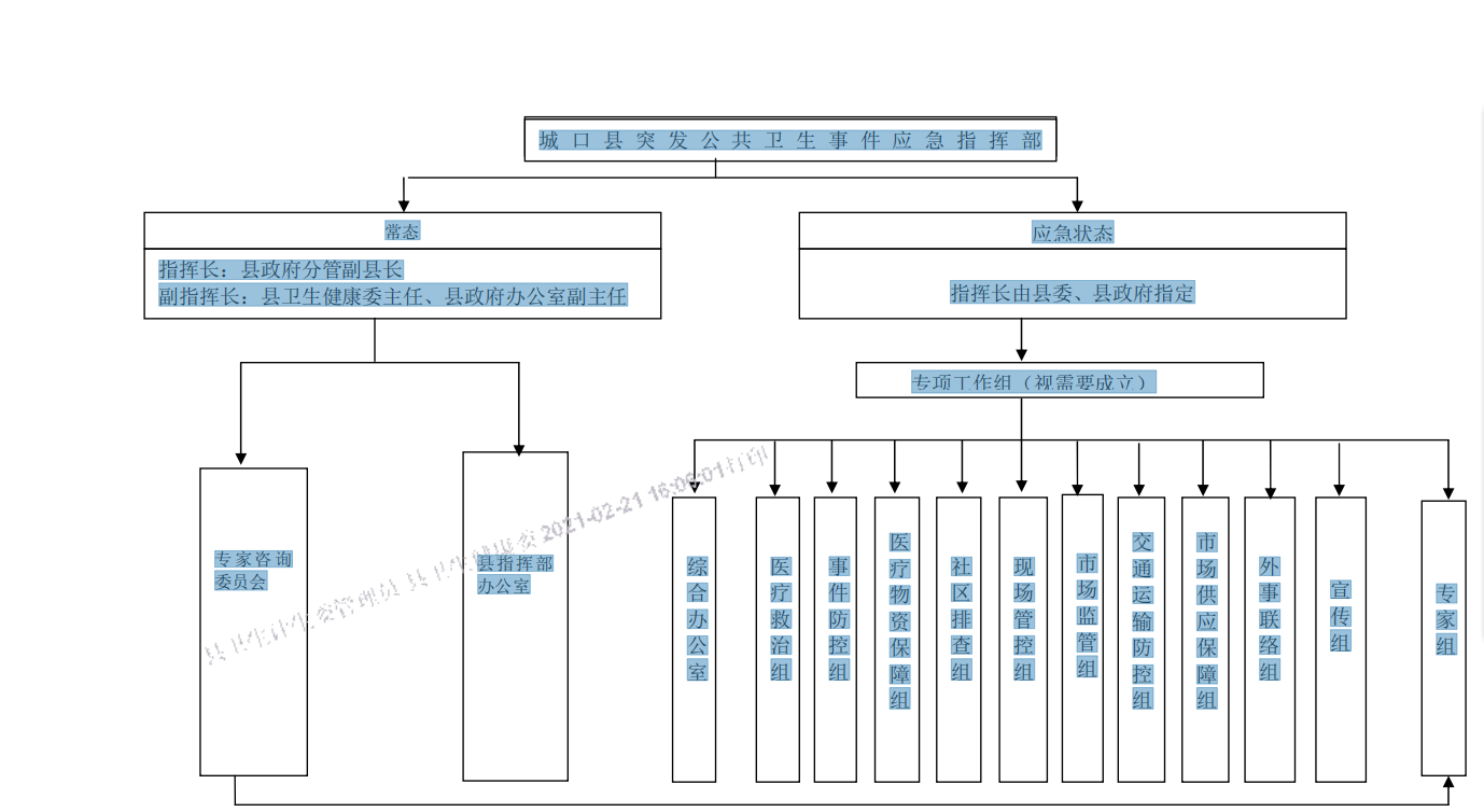 2.1.1在县委、县政府统一领导下,设立城口县突发公共卫生事件应急指挥部(以下简称县指挥部),在县卫生健康委设立县突发公共卫生事件应急指挥部办公室(以下简称县指挥部办公室)。
