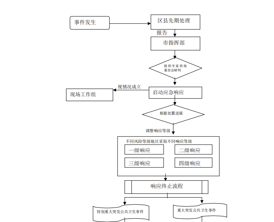 4.2.1分级负责一般突发公共卫生事件由县政府成立组织指挥机构负责应急处置。较大突发公共卫生事件由县政府成立组织指挥机构负责应急处置,报请市卫生健康委给予业务指导。重大突发公共卫生事件由市指挥部负责应急处置。特别重大突发公共卫生事件在国家统一指挥下,由市指挥部落实属地处置责任,接受国家卫生健康委业务指导。
