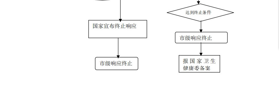 4.3.2终止程序特别重大突发公共卫生事件国家宣布终止应急响应后,市突发公共卫生事件应急响应自动终止。重大突发公共卫生事件经处置,达到应急响应终止条件的,由市指挥部决定终止,并向国家卫生健康委备案。较大突发公共卫生事件和一般突发公共卫生事件经处置,达到应急响应终止条件的,由县组织指挥机构决定终止,并报市卫生健康委备案。