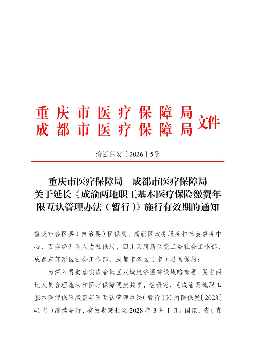 关于延长《成渝两地职工基本医疗保险缴费年限互认管理办法(暂行)》施行有效期的通知
