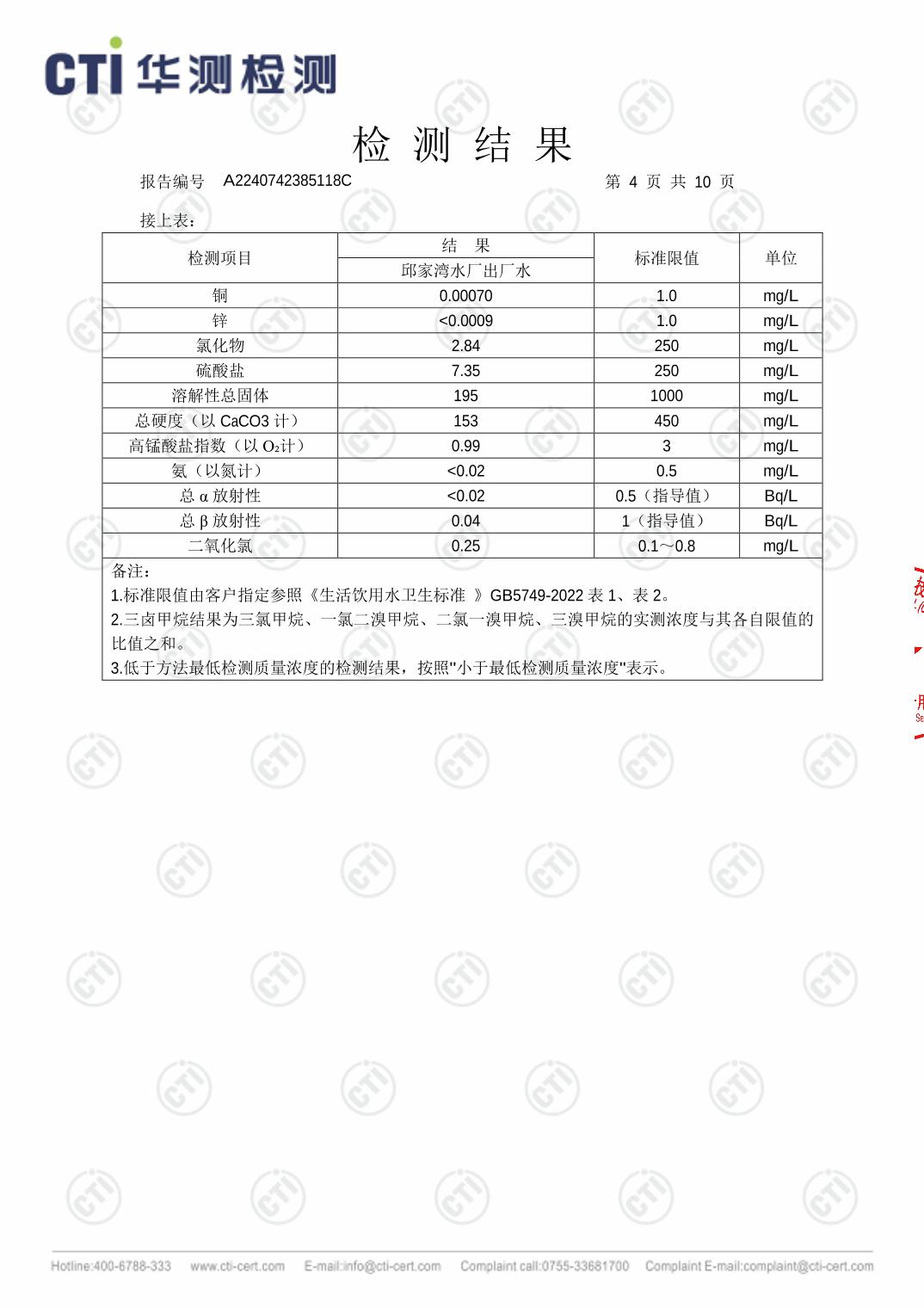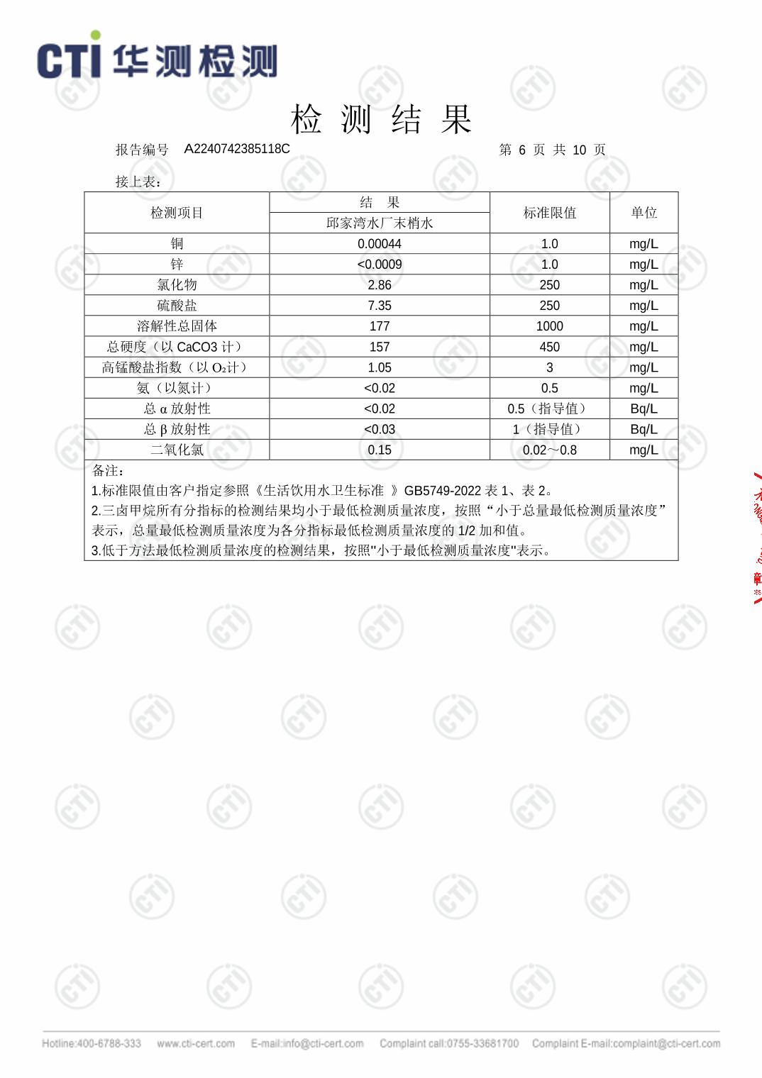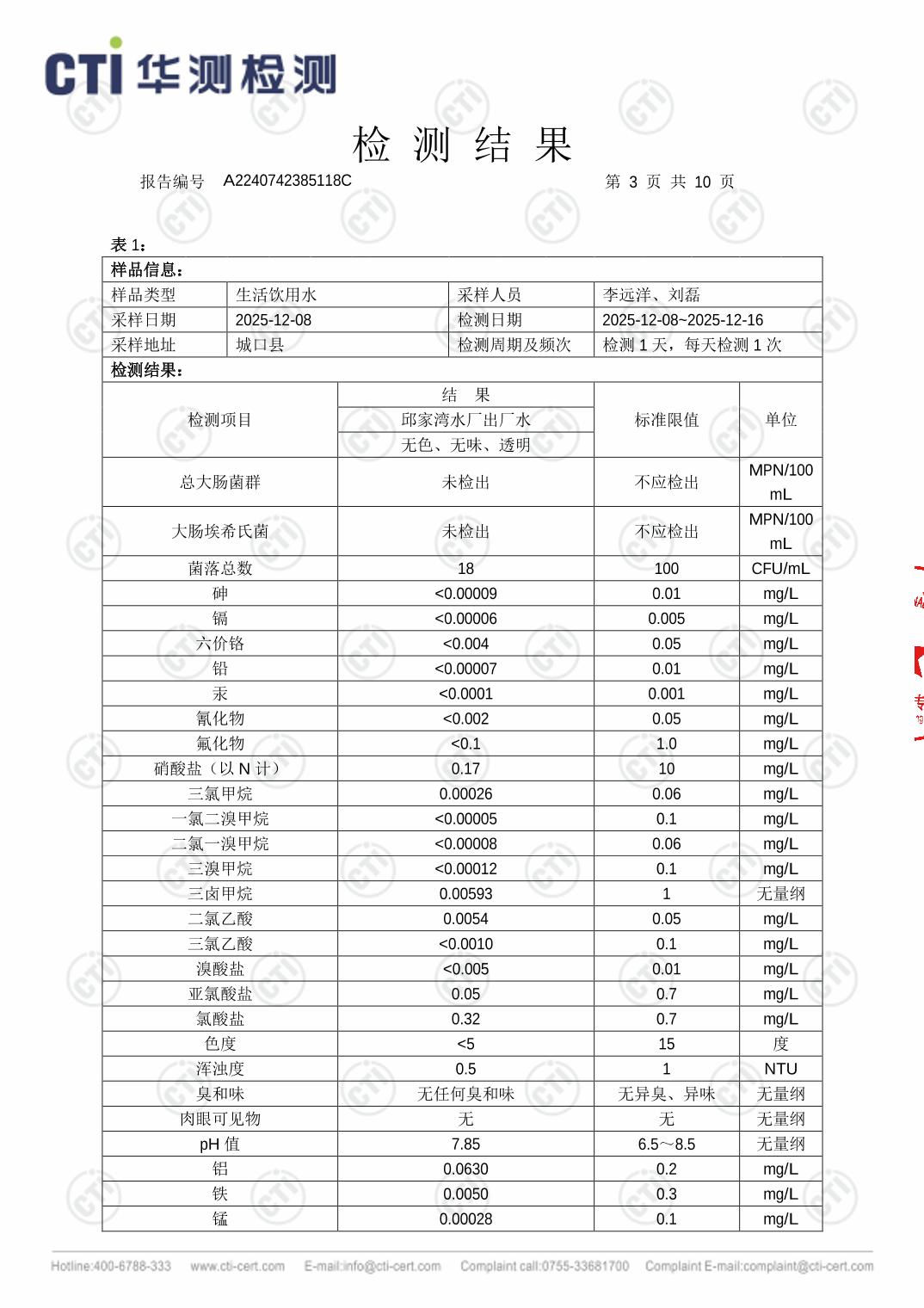 城口县邱家湾水厂12月份生活饮用水检测报告