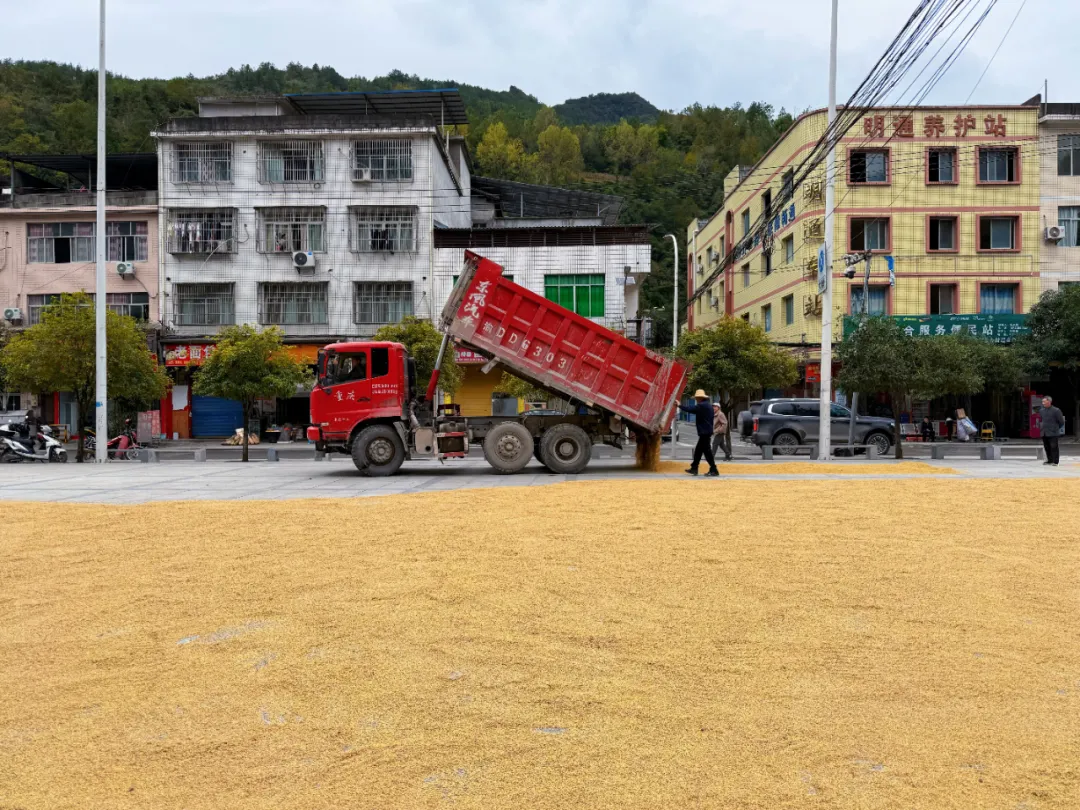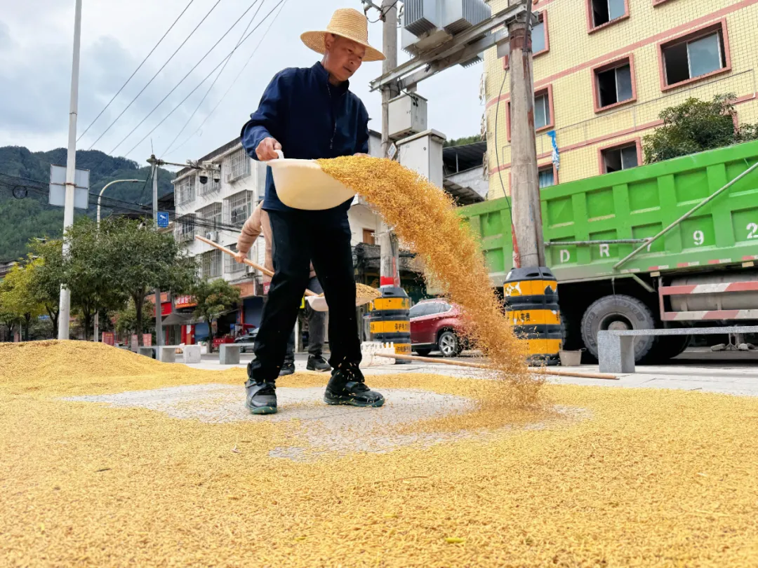 集镇的商铺老板也笑着说:“每年这个时候,广场就成了‘共享晒谷场’,看着满街的金黄,连空气里都是粮食的甜香,这是咱明通人最幸福的‘秋之味’。”从清晨到傍晚,广场上的人影与稻浪同频律动,成为明通镇秋日里最具烟火气的风景线。
