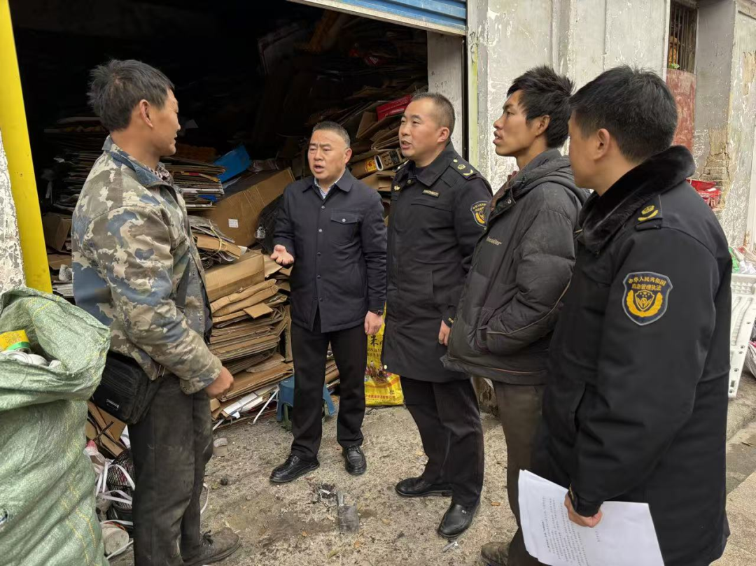 12月18日,复兴街道党工委书记范安武(右四)带队对辖区再生资源回收站开展消防安全专项检查,重点对消防设施配备、用电安全管理及货物堆码隐患等进行排查整治。