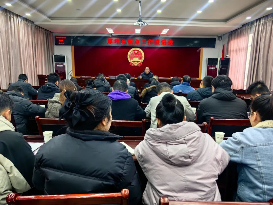 12月18日,厚坪乡乡长田道野(前排中)主持召开重点工作推进会,并就近期医保收缴、机要保密、安全稳定等工作进行部署。