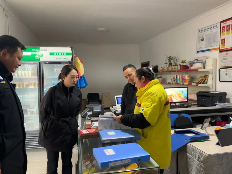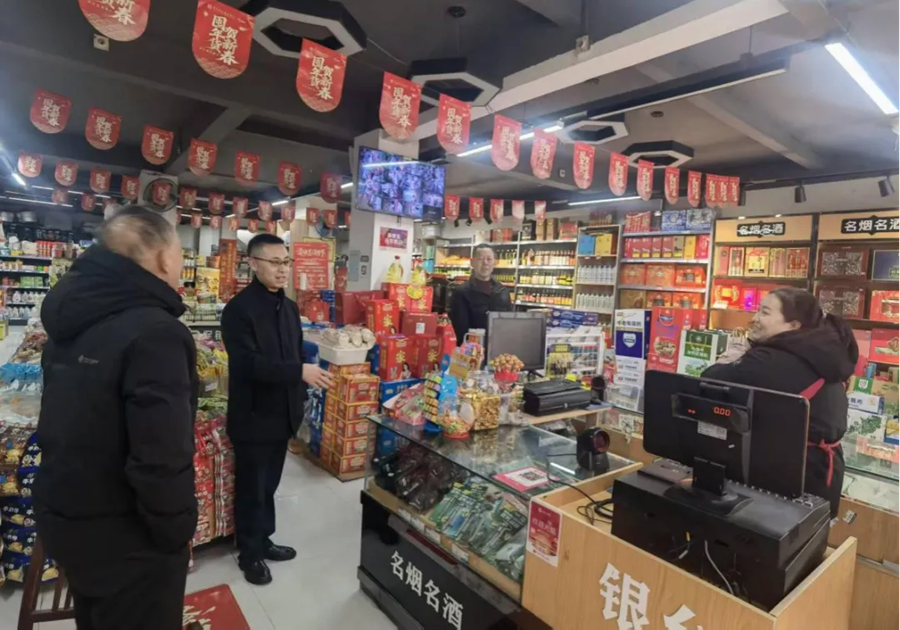 1月2日,鸡鸣乡党委书记贺鹏(左二)带队深入辖区商户开展慰问走访活动,向商户们致以节日的问候,并实地查看其经营业态、市场供需、食品安全、消防应急等情况,认真听取商户经营过程中的实际需求与意见建议,保障公平有序的市场环境。