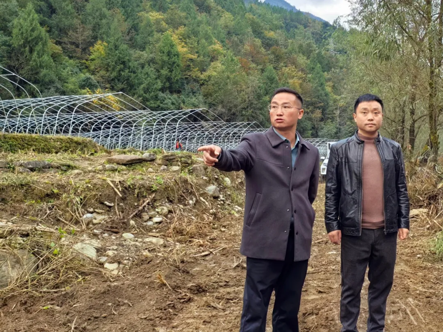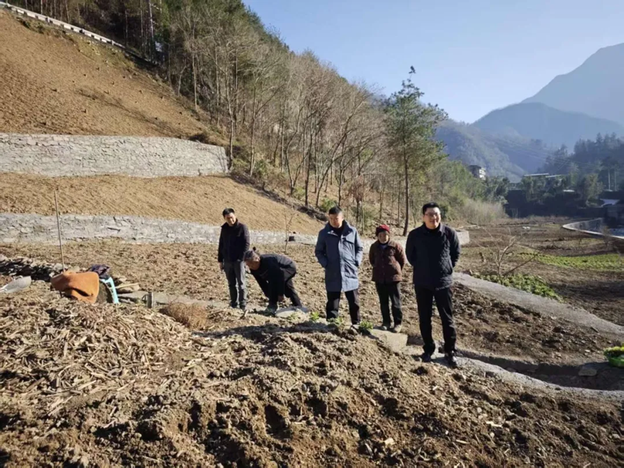 2025年12月29日,修齐镇党委书记邹传跃(左二)带队调研淫羊藿产业发展情况,提出要全面推广标准化育苗和科学种植技术,让淫羊藿成为修齐镇支柱型林下产业。
