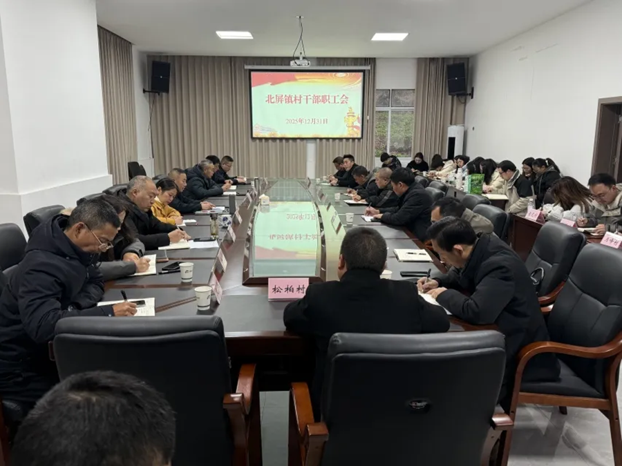 2025年12月31日,北屏镇党委书记孙廷怀(左五)主持召开北屏镇村干部职工会议,传达县委经济工作会议精神,调度平安稳定、环保卫生、旅游环境等工作。