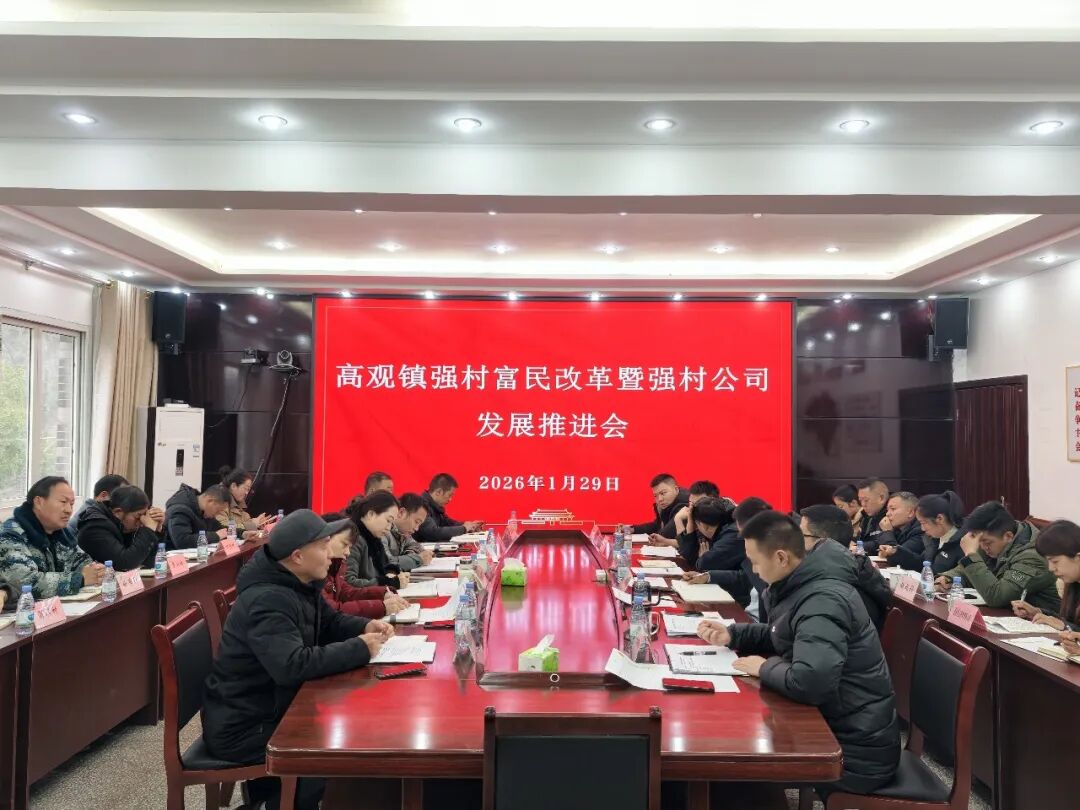 1月29日,高观镇党委书记庞雪飞(左排中)组织召开高观镇强村富民改革暨强村公司发展推进会,提出要规范公司运营、盘活镇村资源、做强特色产业,以强村公司为引擎,推动强村富民落地见效。