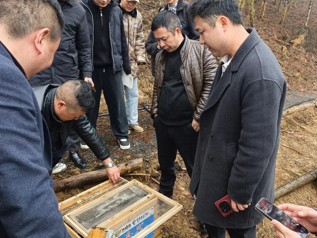 3月16日,巴山镇党委书记杨永国(右二)到万草堂中药材公司调研中药材产业发展情况。实地了解“林药蜂”立体产业结构试点成效。