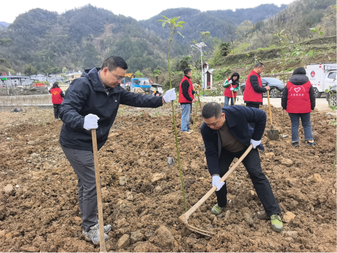 3月18日,咸宜镇党委书记万正君(右)带队在青龙村开展义务植树活动,号召大家以切实行动守护咸宜的青山绿水。