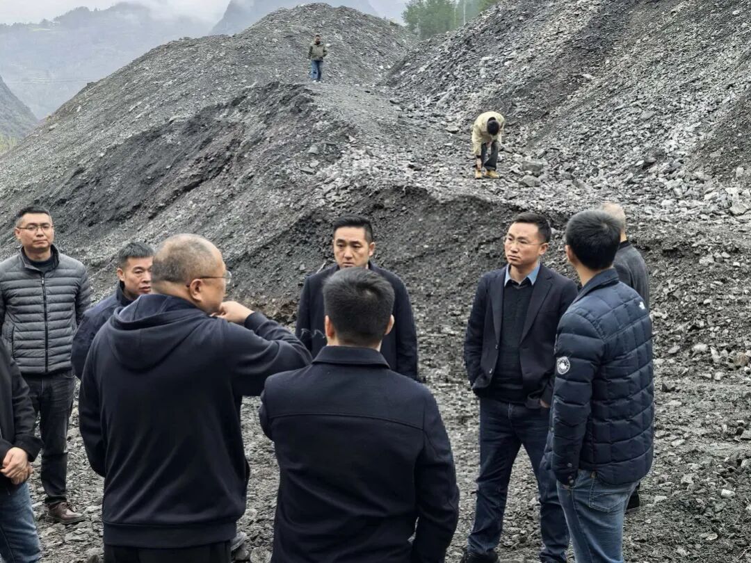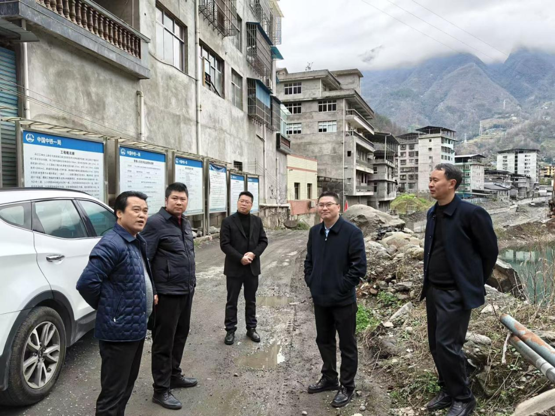 3月19日,蓼子乡党委书记符美森(右二)带队联合高指办、重庆高速集团到长湾村磨槽湾高速弃渣场现场查看行洪水沟建设情况及施工安全。