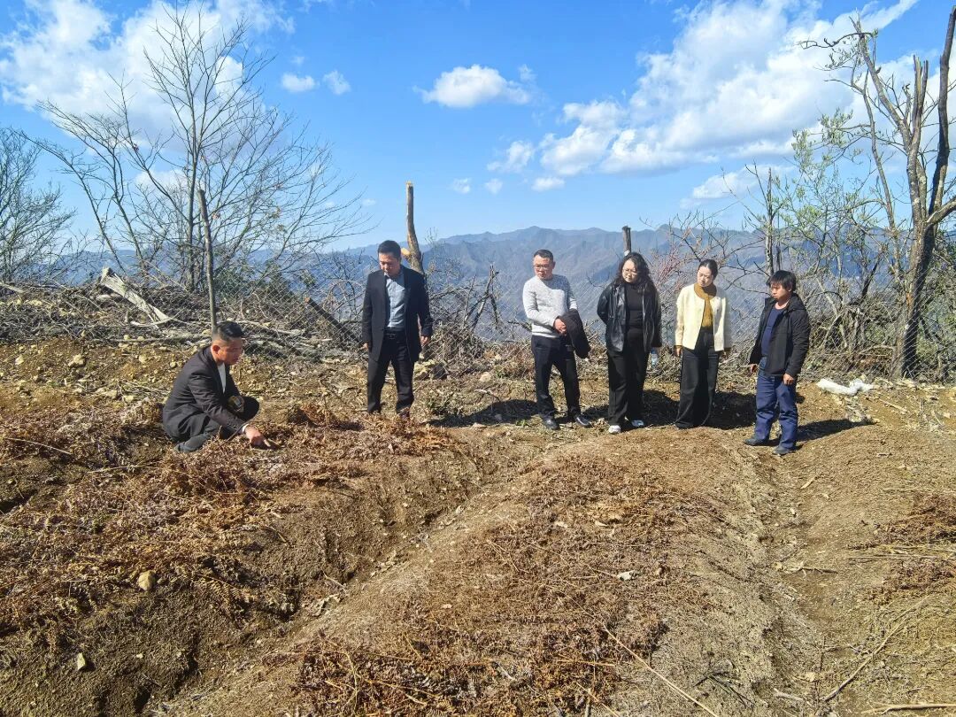 3月31日,巴山镇党委书记杨永国(左二)到新岭村中药材种植基地实地调研道地药材规范化种植、良种繁育及基地生产情况。