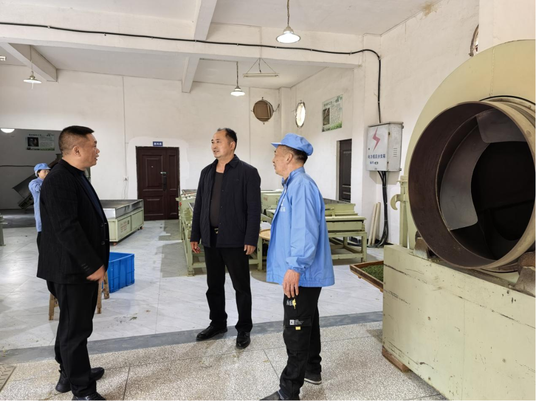 3月30日,咸宜镇党委书记万正君(左一)实地调研青龙村雪山茗芯茶厂,深入了解企业生产、销售以及企业在发展中遇到问题。