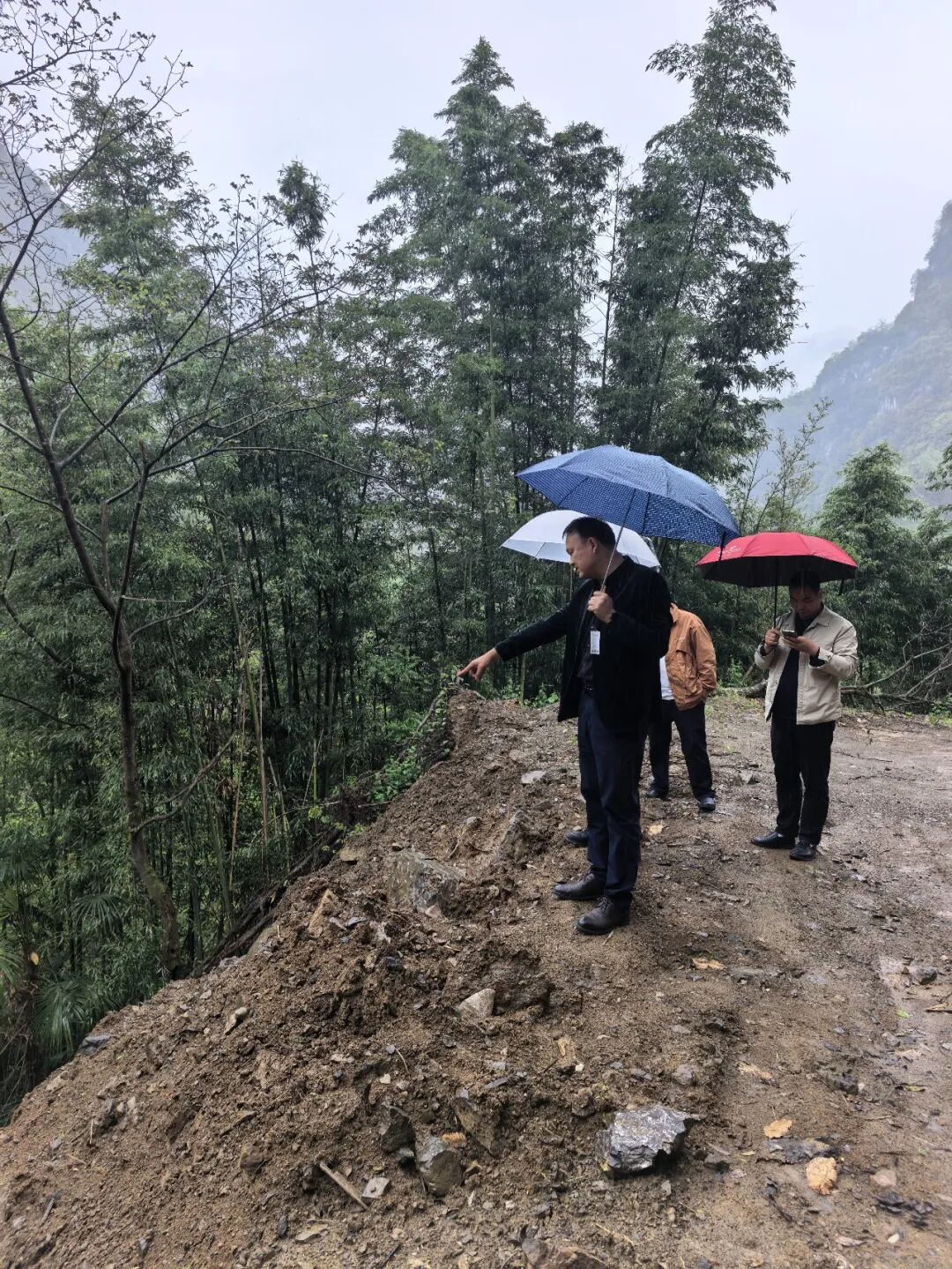 4月24日,北屏镇党委书记孙廷怀(左一)带队实地督导国道G211线渝陕界梁段危岩边坡整治项目。