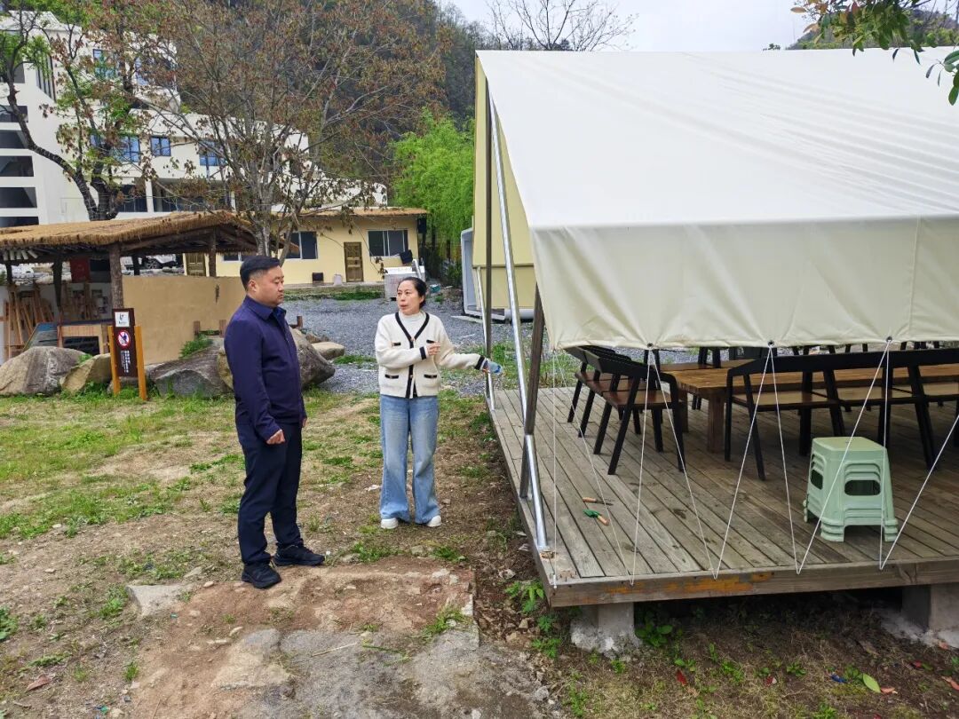4月20日,河鱼乡党委书记代忠相(左)到两扇门度假区查看民宿旅游旺季游客接待筹备及“五一”假期订房情况,详细查看客房设施、餐饮卫生、消防安全等细节,提出要以细节提升品质、以服务温暖人心。
