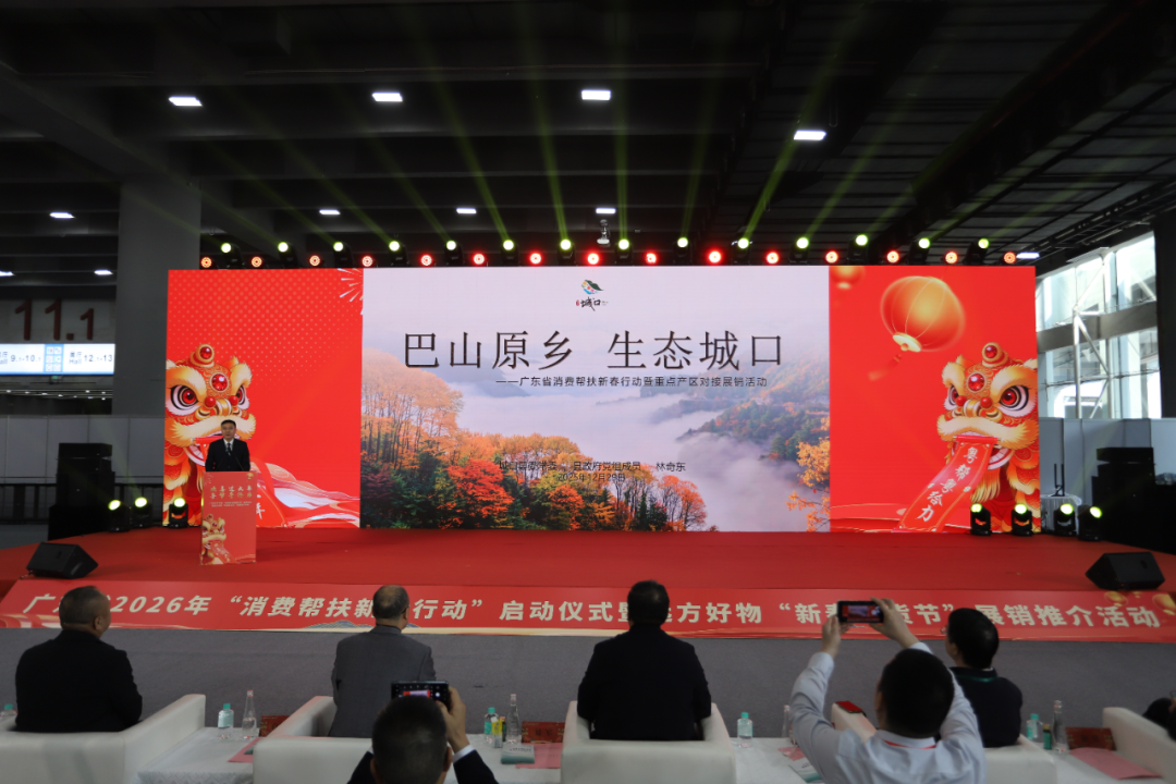 12月29日,广东省2026年“消费帮扶新春行动”启动仪式在广州市广交会展馆B区11.1馆举办。我县作为消费帮扶重点产区受邀参加该活动。