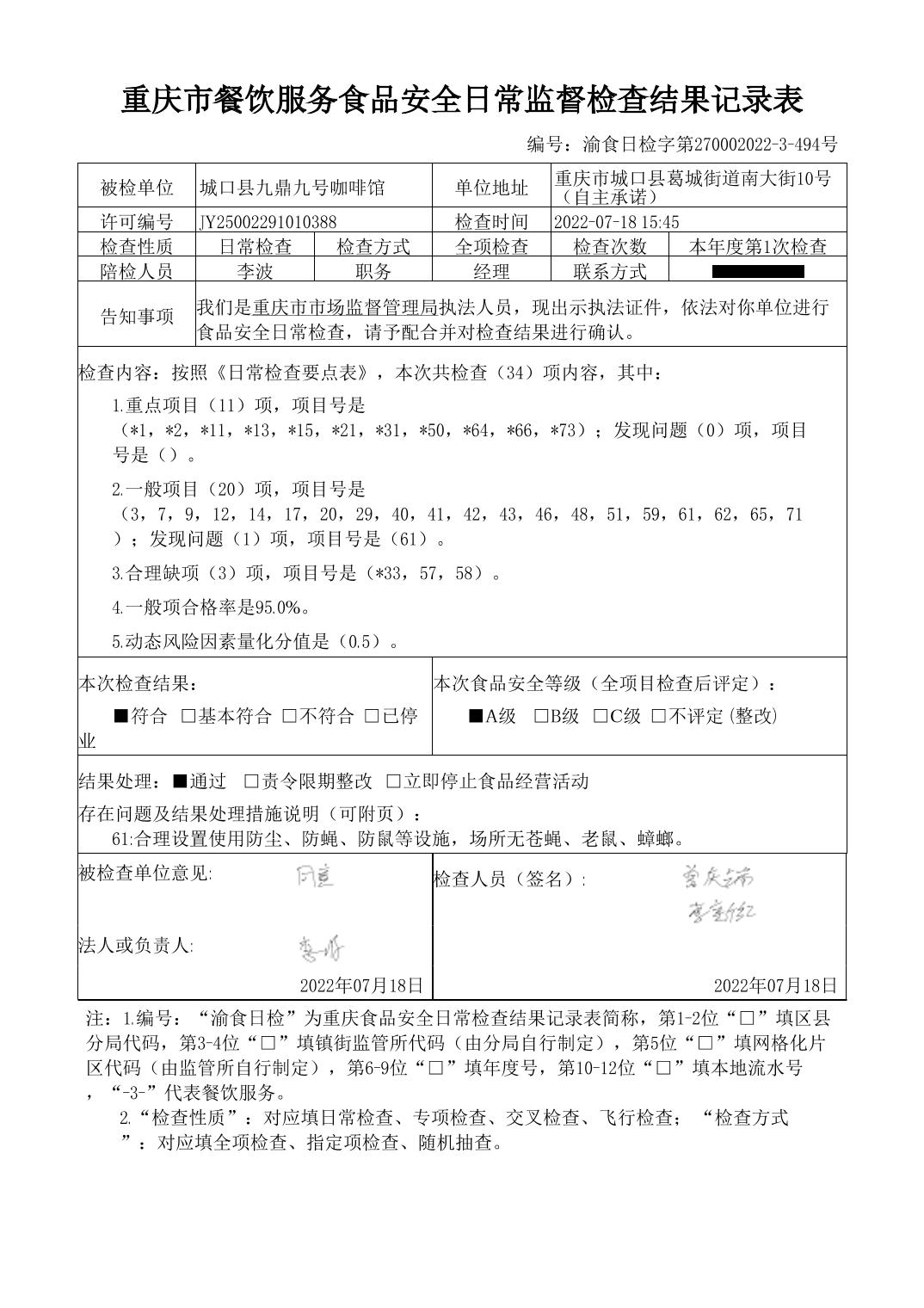 城口县九鼎九号咖啡店餐饮服务食品安全日常监督检查结果记录表
