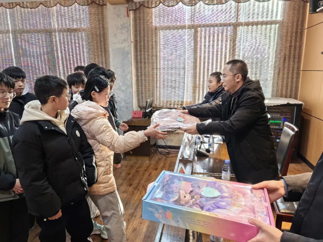 1月27日,明通镇党委书记林璨(右一)到明通中学开展“冬日阳光·温暖你我”活动,为部分在校困难学生发放心愿礼物,传递党委政府的关怀与新春祝福。