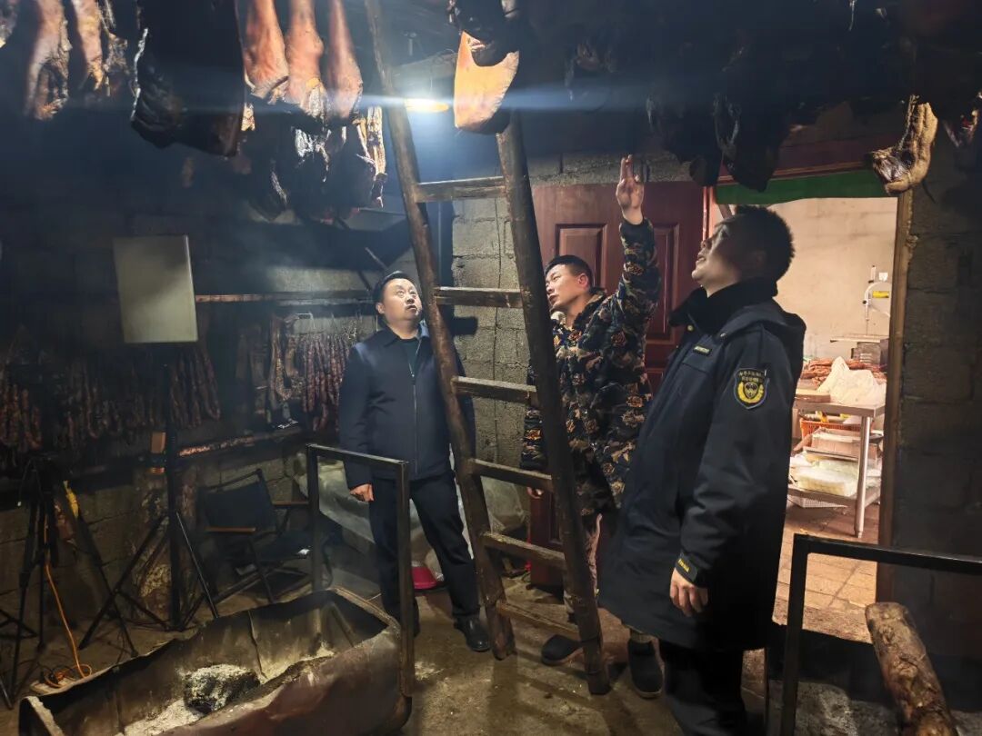 1月26日,河鱼乡党委书记代忠相(左)带队到辖区4个老腊肉炕房检查消防安全。提出炕制区域要远离柴草、塑料等易燃杂物,安排专人值守,全程紧盯火情;要配齐配足灭火器材,经营户要熟练掌握基本操作方法。