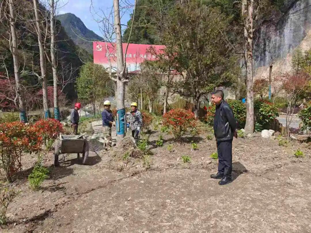 4月1日,治平乡党委书记李长建(右)深入一线,实地查看辖区环境绿化施工进展,详细了解苗木栽植、养护管理及工程推进情况
