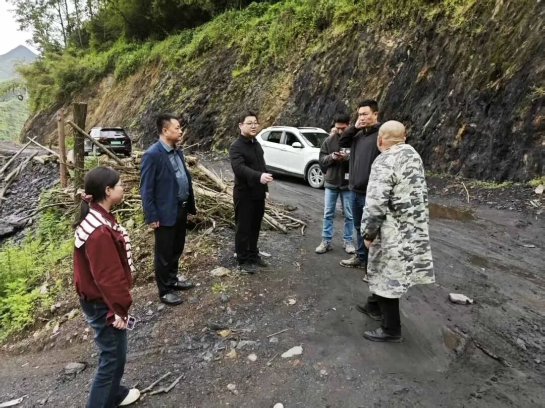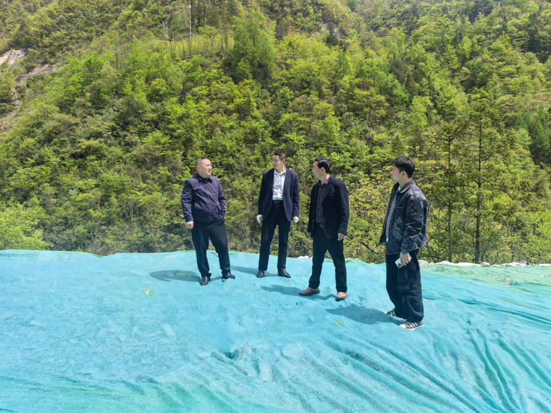4月24日,北屏镇党委书记孙廷怀(左一)带队实地督导国道G211线渝陕界梁段危岩边坡整治项目。