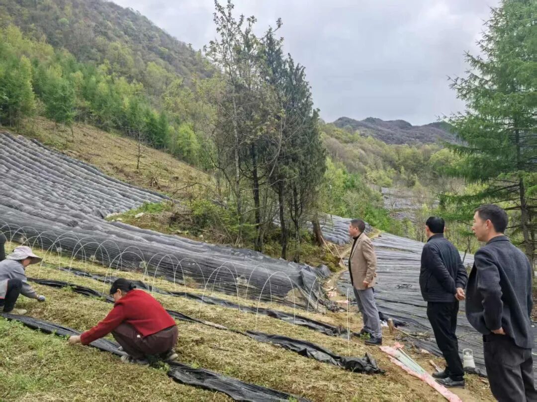 4月22日,治平乡党委书记李长建(右三)深入新红村,实地查看黄连播种栽植情况,细致了解药材种植进度与管护举措,扎实推进本地中药材产业稳步发展。