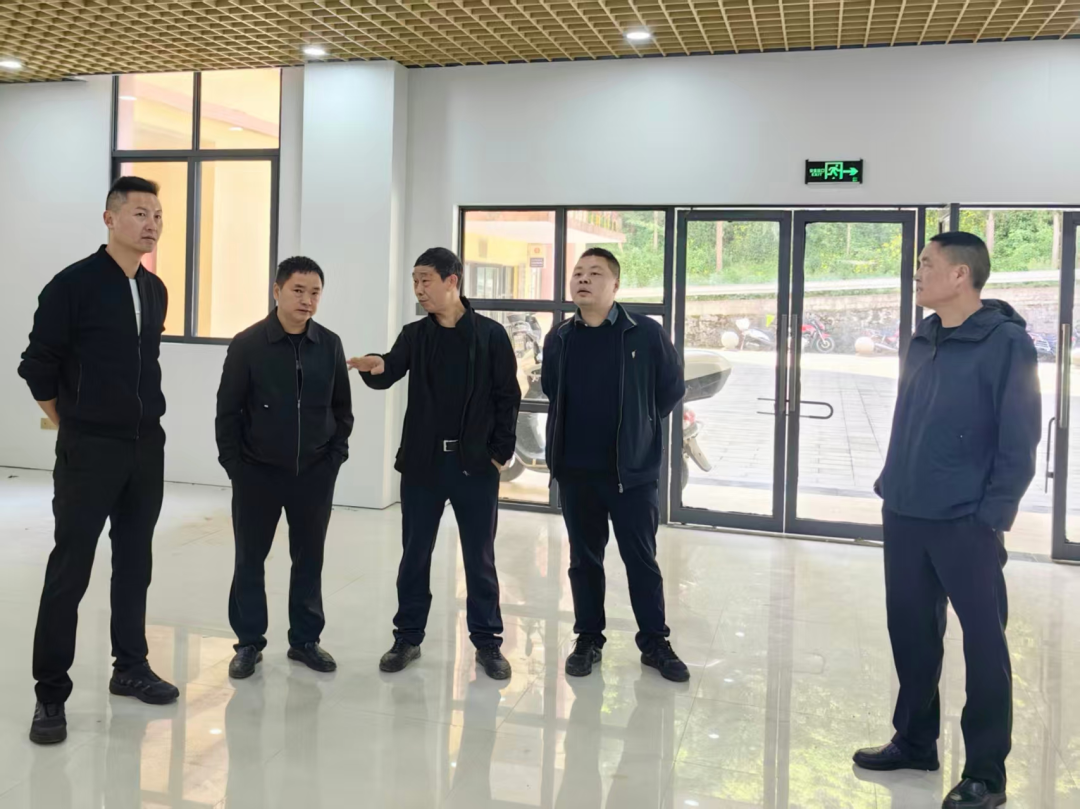 4月23日,沿河乡党委书记谭天平(左一)实地查看便民服务中心项目建设情况,并就功能布局、服务设施配套、工程质量管控等方面提出具体要求。