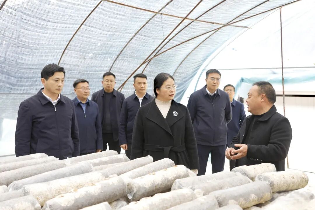 在北屏镇太平社区城口县嵘彬农业开发有限公司食用菌基地和农产品集散中心,王春梅一行边走边看,详细了解产业规模、基地建设、联农带农等情况。